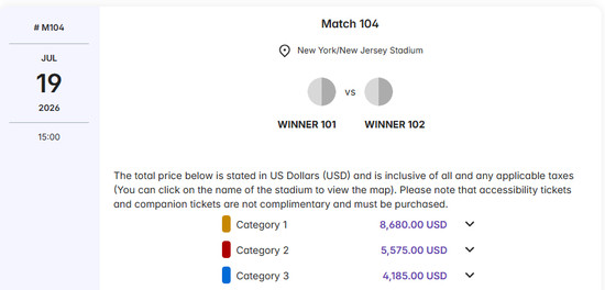 即使只看小组赛,门票定价也不低。根据FIFA官网公布的票价,英格兰队首战在美国达拉斯对阵克罗地亚,最便宜的门票也要265美元(约合1870元人民币)。