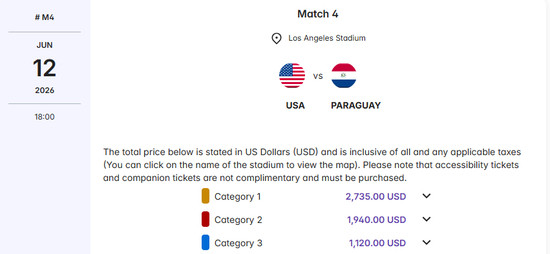 比赛门票价格因场次、比赛地点和参赛队伍而异。对于当地球迷来说,美国队第一场小组赛(在洛杉矶对阵巴拉圭队),最便宜门票的定价为1120美元(约合7901元人民币)。